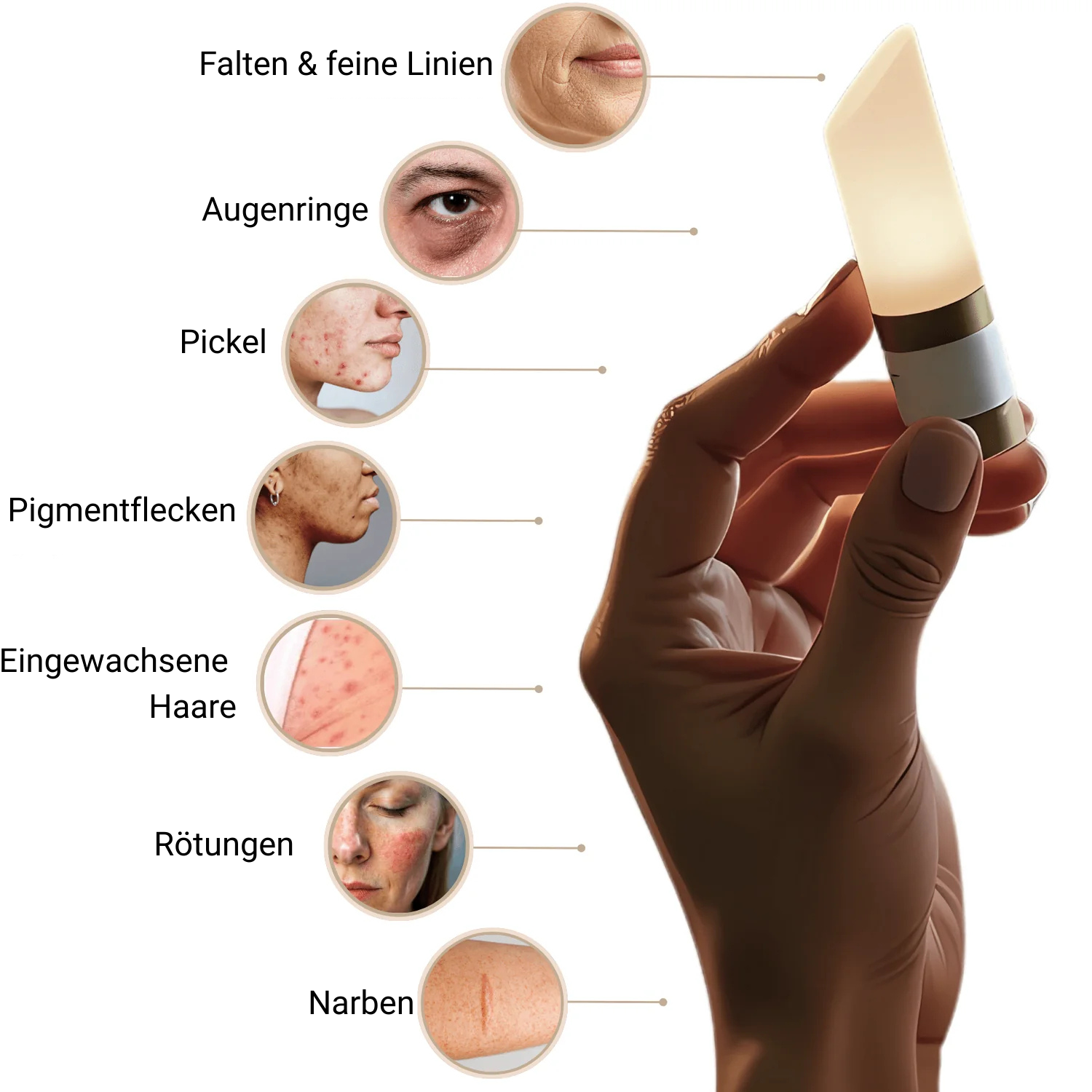 Schluss mit Schubladen voller unwirksamer Kosmetikprodukte! Der DiamondStick® ist dein ultimatives Microdermabrasion-Tool, entwickelt, um viele Hautthemen mit nur einem Schritt anzugehen. Falten, Pickel, Augenringe, Narben, Pigmentflecken, eingewachsene Haare, Dehnungsstreifen oder Rötungen – er exfoliert, regeneriert und bringt deine Haut schon ab der ersten Anwendung zum Strahlen.